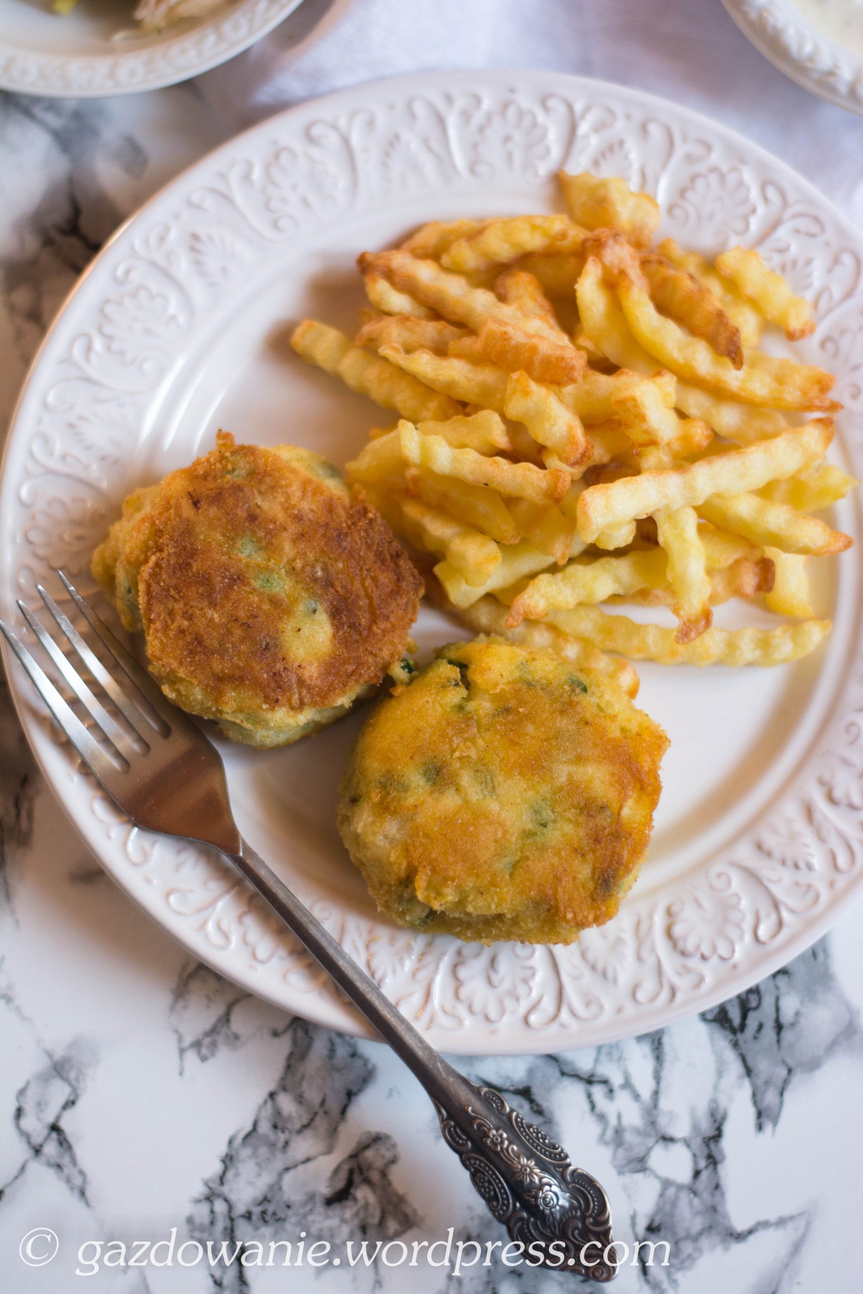 KOTLECIKI Z DORSZA Z ZIELONYM GROSZKIEM I SOSEM TATARSKIM