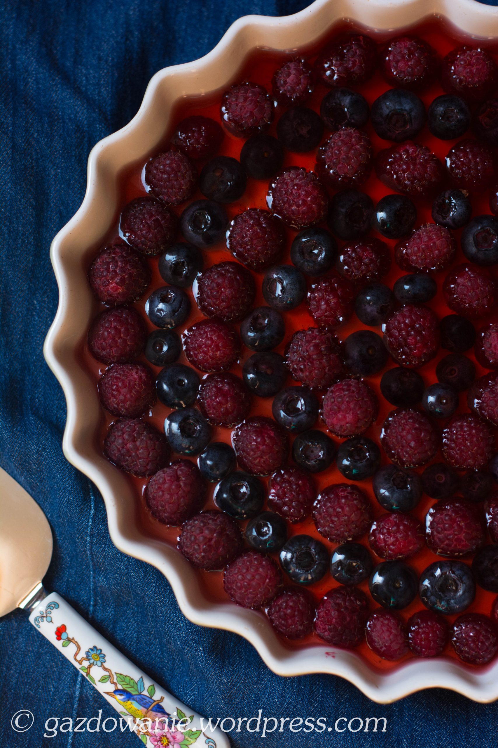 Przygotowujemy galaretkę zgodnie z instrukcją na opakowaniu. Gdy galaretka stygnie, wyjmujemy formę z lodówki i na wierzchu układamy owoce,  które następnie polewamy przestudzoną galaretką. Formę ponownie umieszczamy w lodówce na kilka godzin lub całą noc.