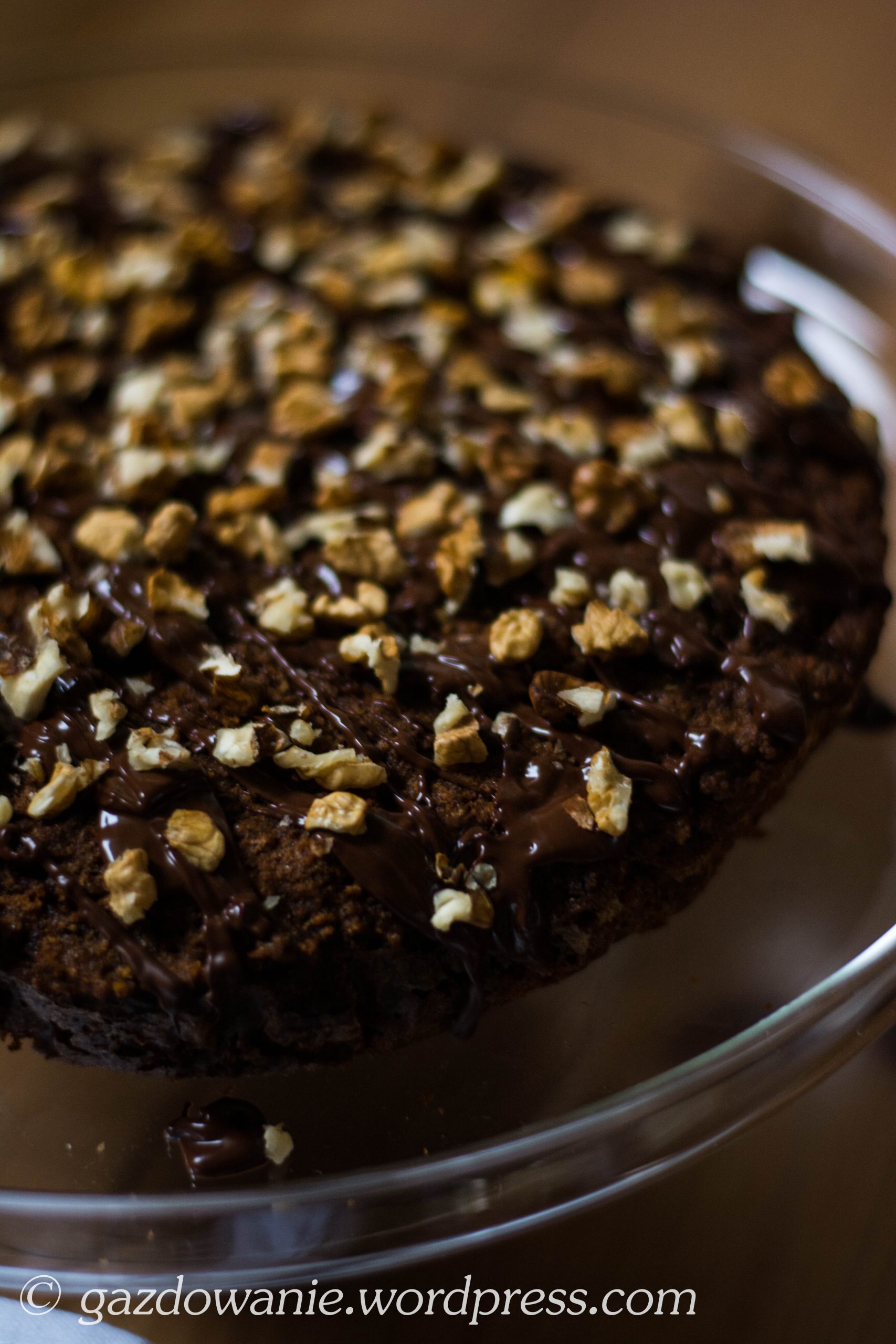 Ciasto wyjmujemy z piekarnika, by ostygło na kuchennej kratce. W międzyczasie przygotowujemy polewę: w kąpieli wodnej roztapiamy czekoladę i masło, a następnie dokładnie mieszamy, by składniki połączyły się. Czekoladą polewamy ciasto, następnie posypujemy je posiekanymi orzechami włoskimi.
