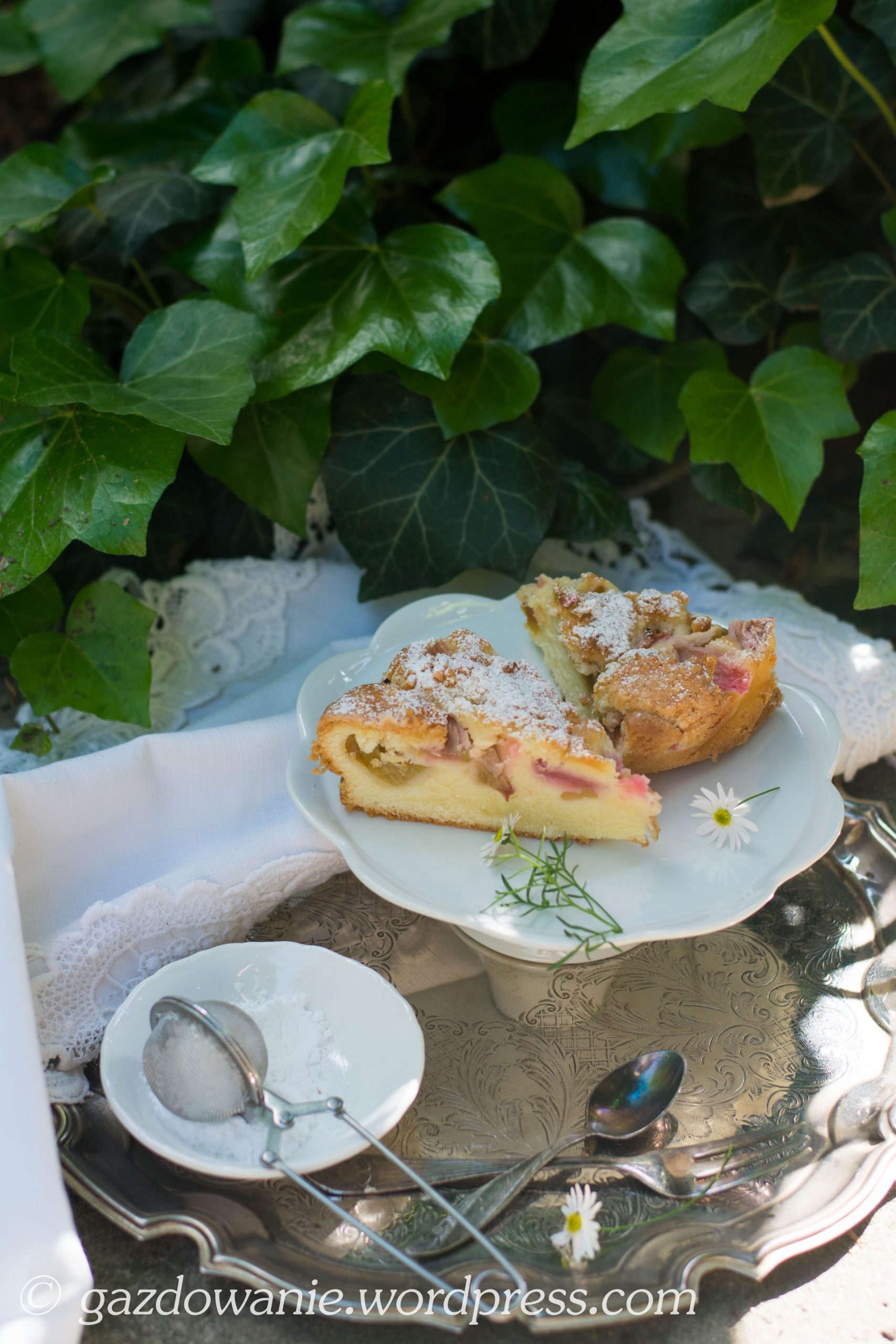 Rabarbar mieszamy z mąką ziemniaczaną i rozkładamy równomiernie na cieście. Do pozostałych 3 łyżek ciasta dodajemy wiórki kokosowe, mieszamy i wylewamy na owoce. Posypujemy cukrem.