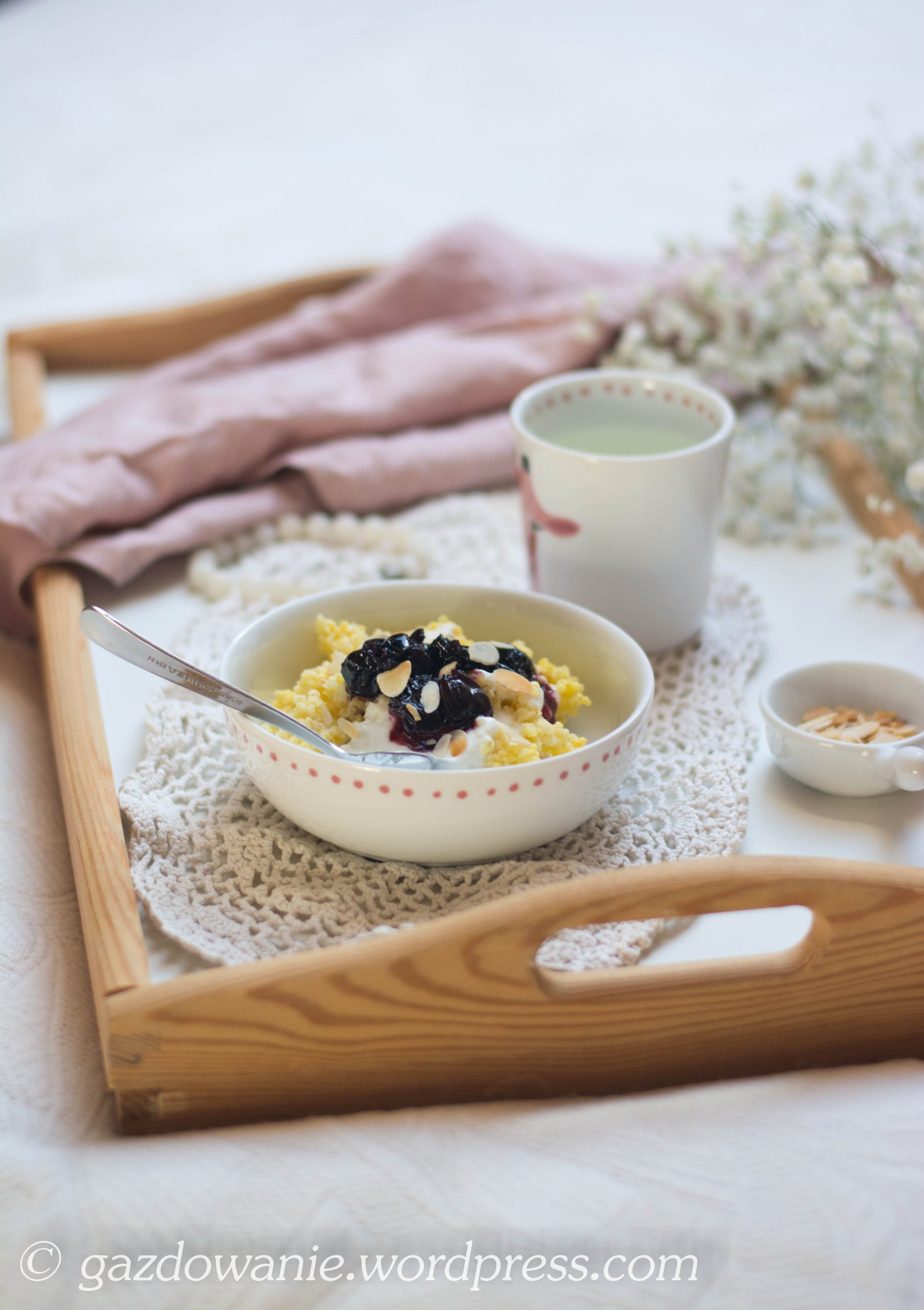 Ptasia stołówka i kasza jaglana z miodowym jogurtem i konfiturą wiśniową