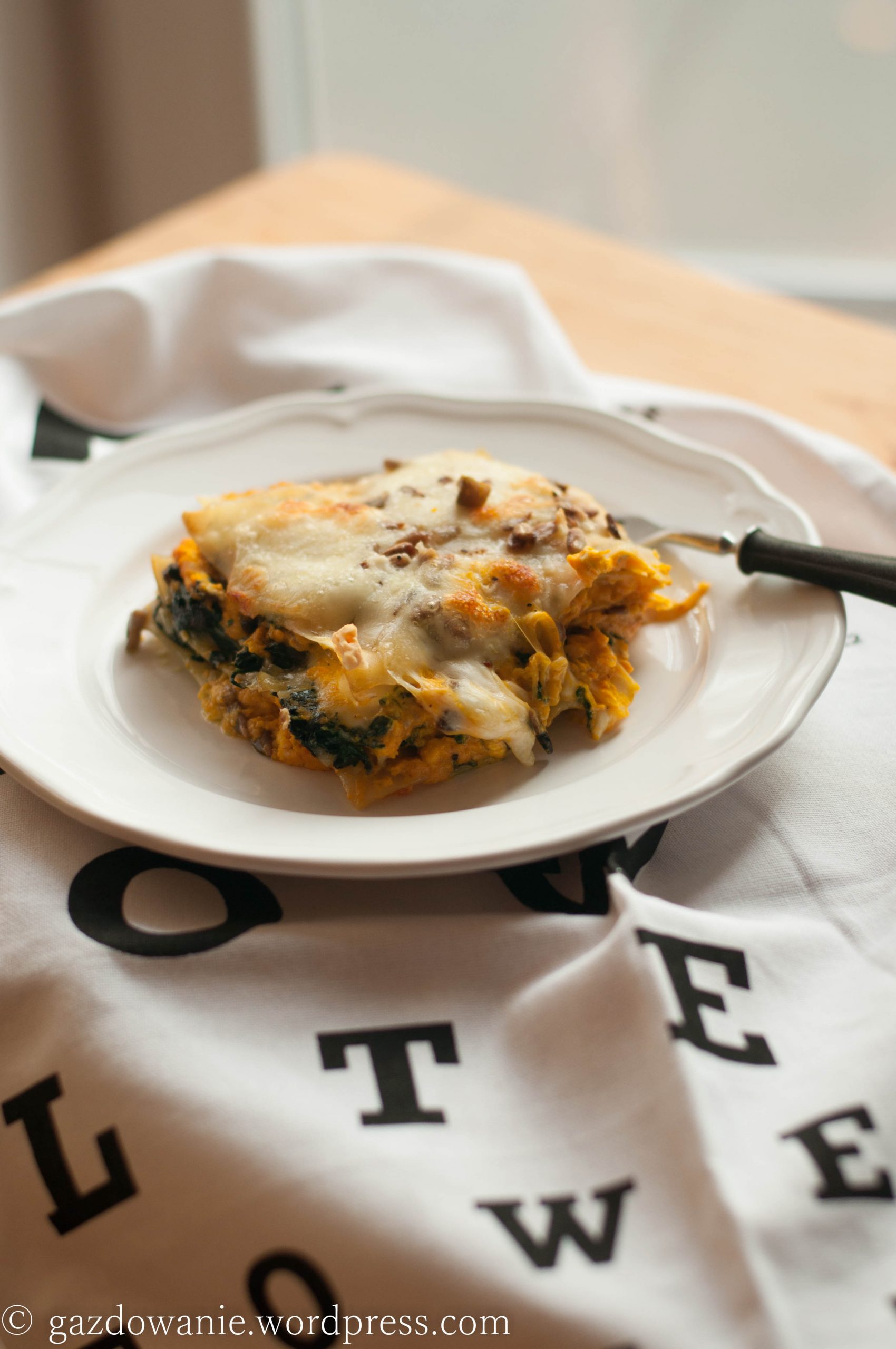 Jednak w ostatnią niedzielę moje drugie podejście do dyni było bardziej ambitne: lazania z musem z pieczonej dyni, szpinakiem z czosnkiem i cebulką oraz pieczarkami, ricottą i mozzarellą. Do tego ser pecorino romano i przyprawy: imbir, gałka muszkatołowa, sól i duża ilość kolorowego pieprzu. Twardy ser i przyprawy nadały daniu właściwy smak, ‚stunningowały’ lazanię.