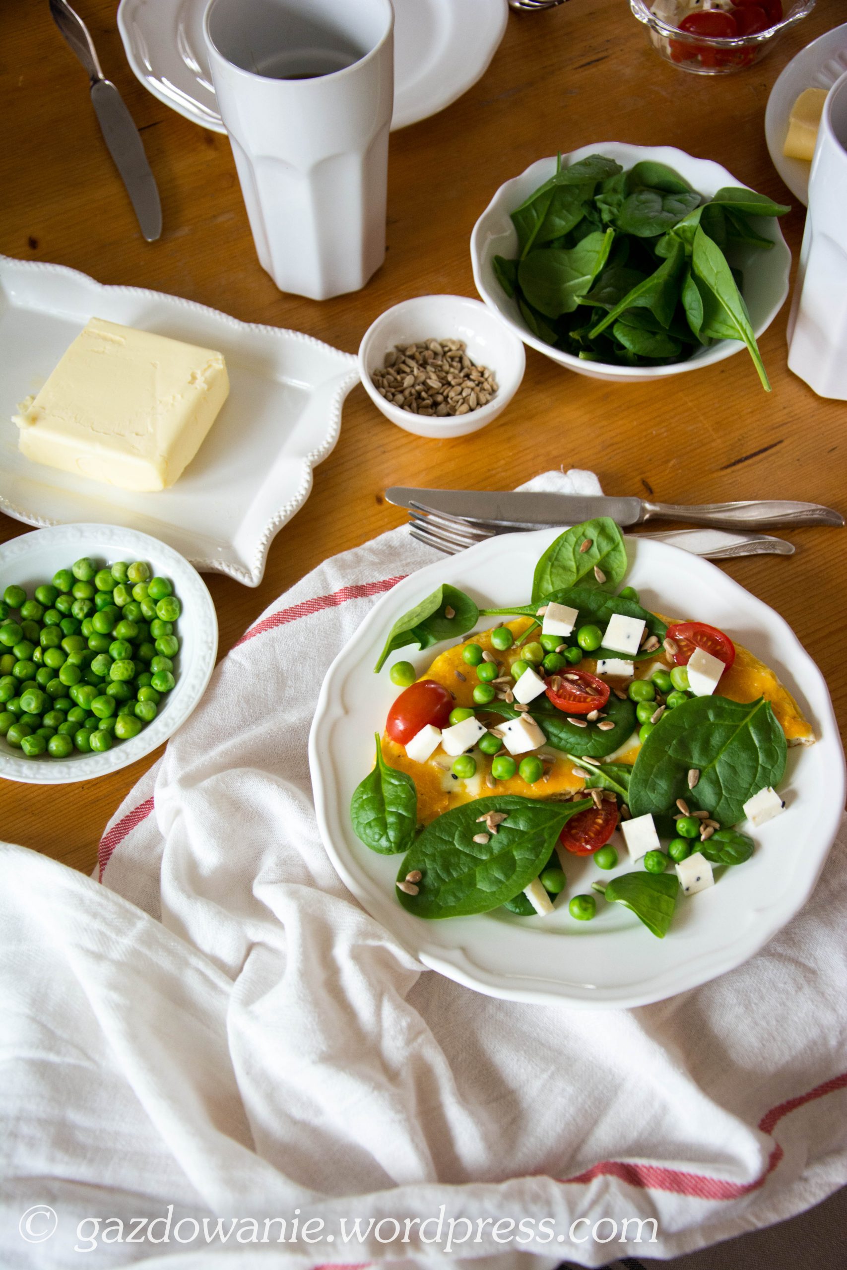WIOSENNY OMLET Z ZIELONYM GROSZKIEM, SZPINAKIEM I SEREM KORYCIŃSKIM