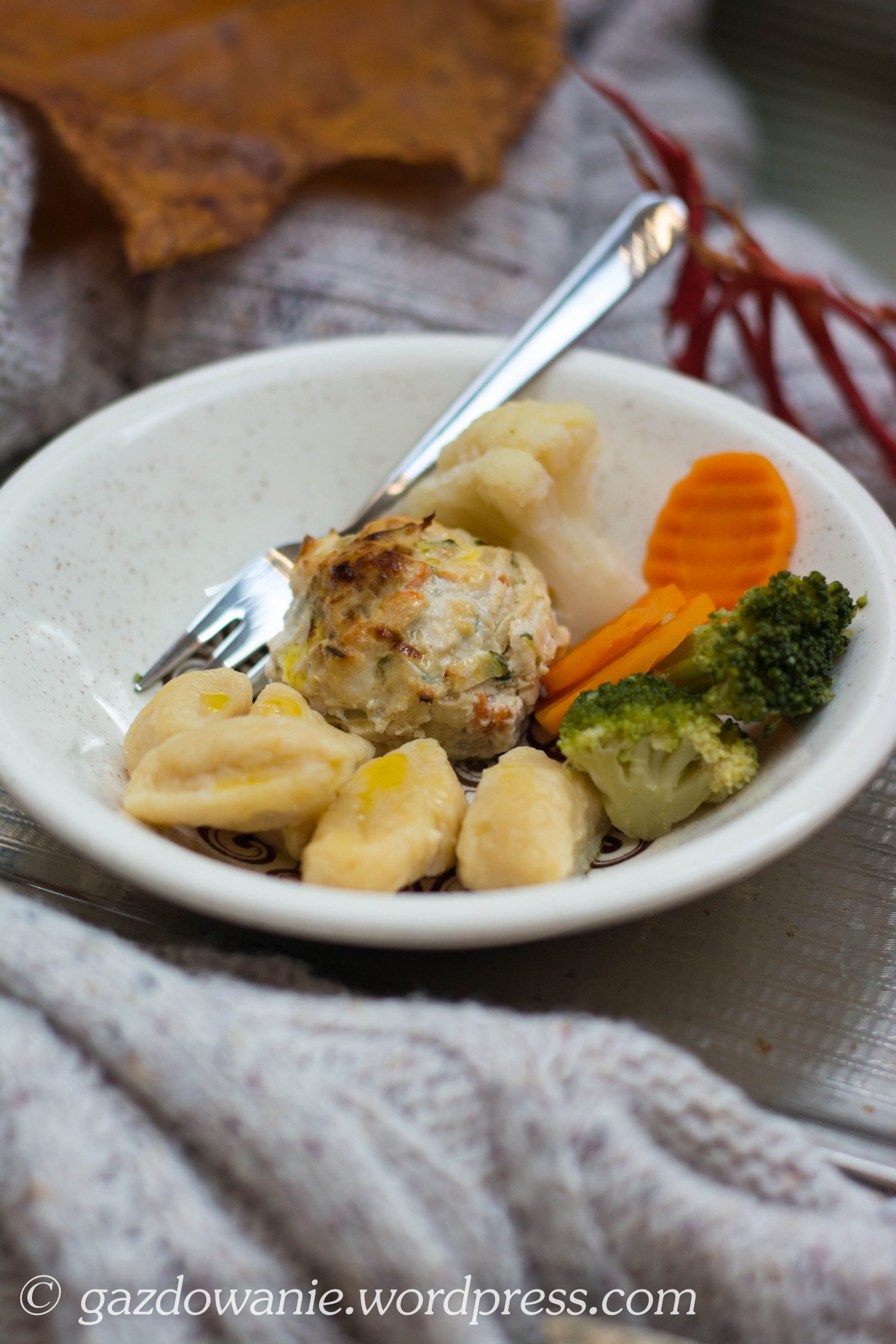 Jeśli Wasze maleństwa nie przepadają za warzywami podanymi sauté, to pomysł na rzeczone pulpeciki może okazać się strzałem w dziesiątkę. Niby jemy mięso, ale gdzieś między kęsami nasz mózg wykrywa warzywno-jarzynową nutę;) W parze z pulpecikami Zu dostała na talerzu dyniowe kopytka i warzywa pieczone na parze.