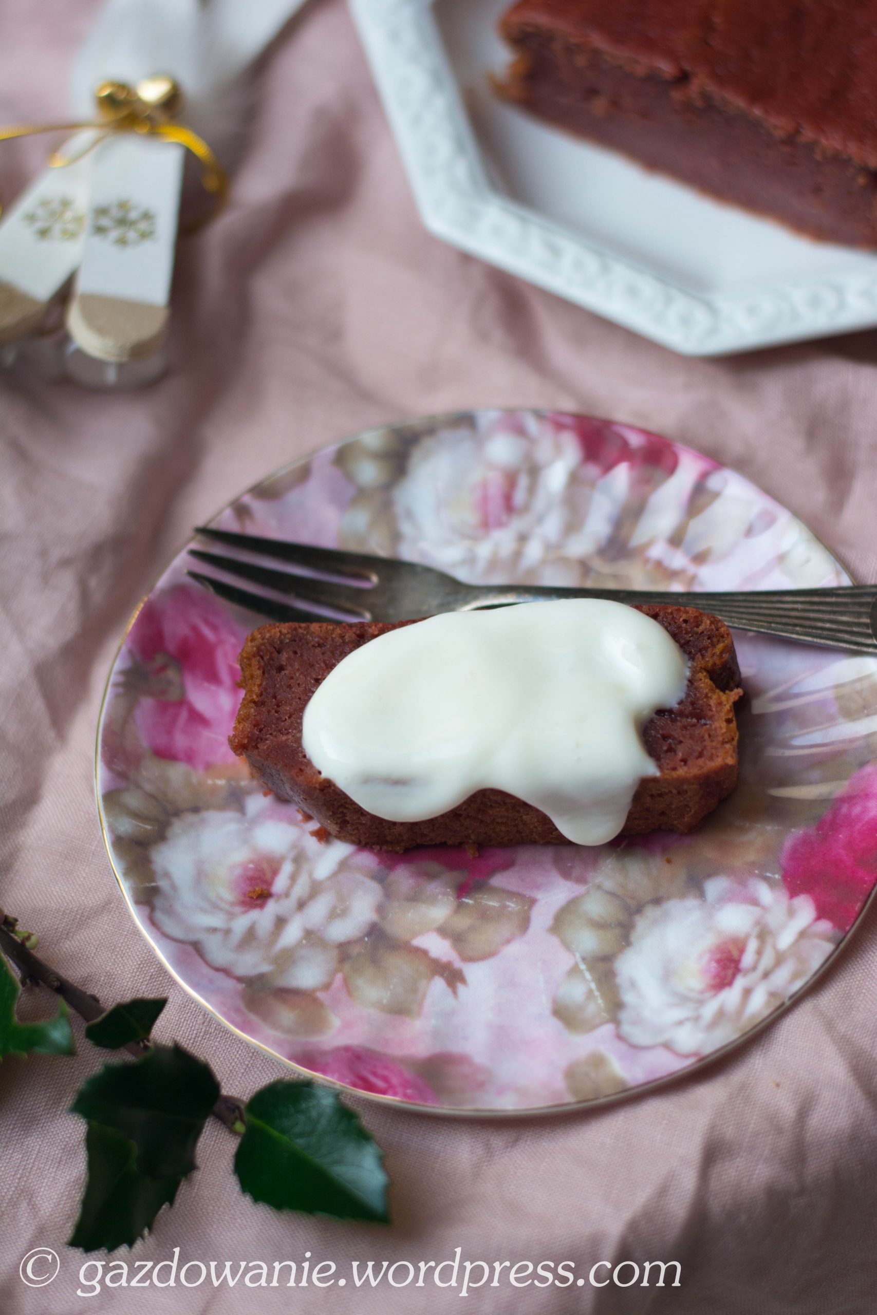 Upieczone ciasto studzimy na kratce kuchennej, po czym kroimy na kawałki i polewamy jogurtem wymieszanym z miodem.